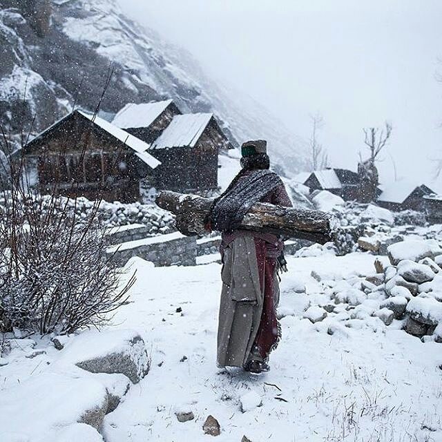 An old lady from Chitkul carrying heavy wooden logs to make the fire in her traditional kitchen to cook food.