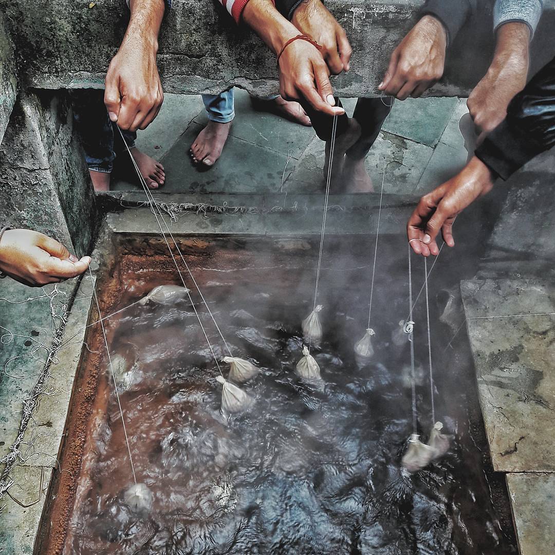 Devotees holding uncooked rice pouches in hot water spring for preparing rice in Manikaran. The temperature is high enough to boil rice, pulses, and vegetables. The naturally evolved spring has no minerals such as Iron or Sulphur in the water,