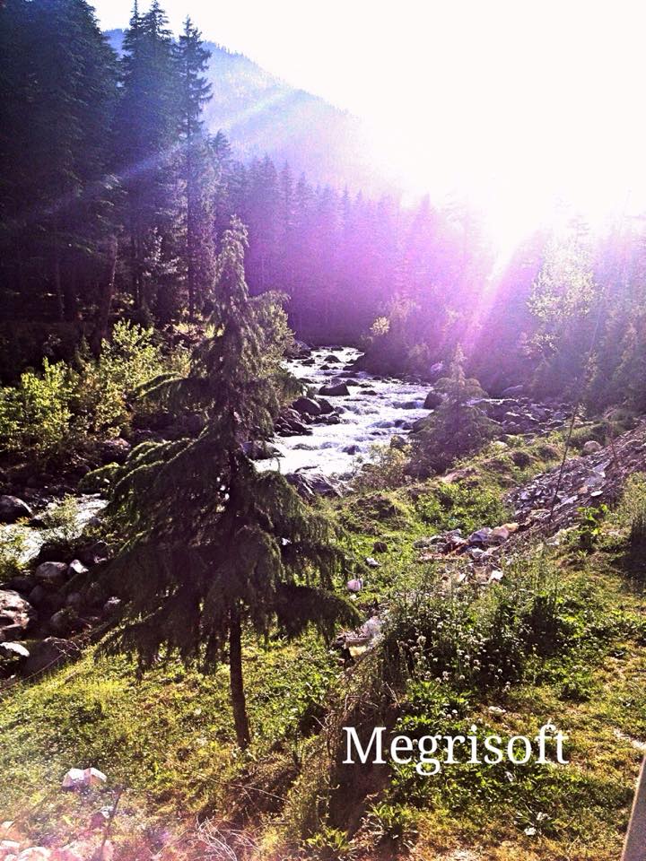 Commendable view of forest merged with water flowing near by with a glimpse of sun rays.
